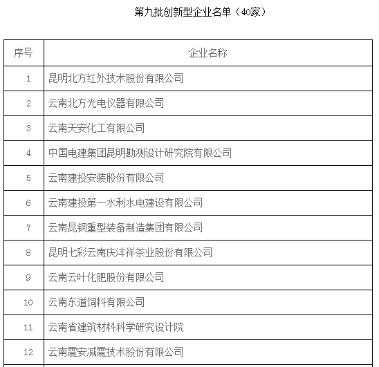 昆明信息港訊 實習(xí)記者刁鳳云 11月2日,云南省科技廳公示關(guān)于第九批云南省創(chuàng)新型企業(yè)名單的通知,擬確定昆明北方紅外技術(shù)股份有限公司等40家企業(yè)為云南省第九批創(chuàng)新型企業(yè)。