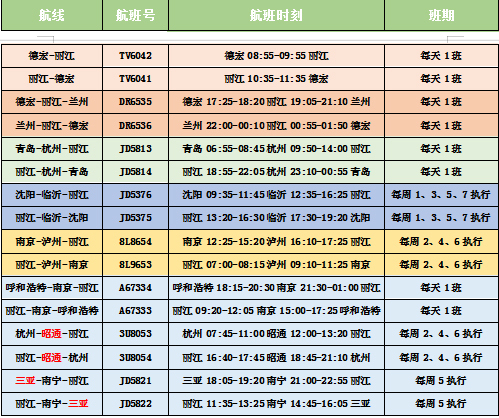 10月28日,紅土航空、瑞麗航空、首都航空分別開通“麗江-南京-呼和浩特”、“德宏-麗江-蘭州”、“麗江-臨沂-沈陽”3條航線;