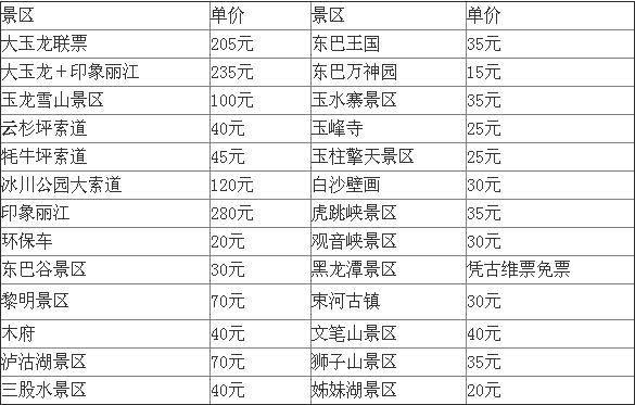 同時景區(qū)景點門票(單人價格)的參考價也有提及。其中一些景區(qū)景點單人價格為:大玉龍聯(lián)票205元(該票票含玉龍雪山景區(qū)、東巴谷景區(qū)、東巴王國景區(qū)、東巴萬神園景區(qū)、玉水寨景區(qū)、玉峰寺、玉柱擎天景區(qū)、白沙壁畫),大玉龍+印象麗江235元,玉龍雪山景區(qū)100元,印象麗江280元,冰川公園大索道120元,東巴谷景區(qū)30元,黎明景區(qū)70元,木府40元,瀘沽湖景區(qū)70元,虎跳峽景區(qū)35元,白沙壁畫30元,束河古鎮(zhèn)30元,文筆山景區(qū)40元。
