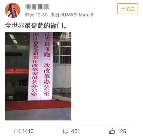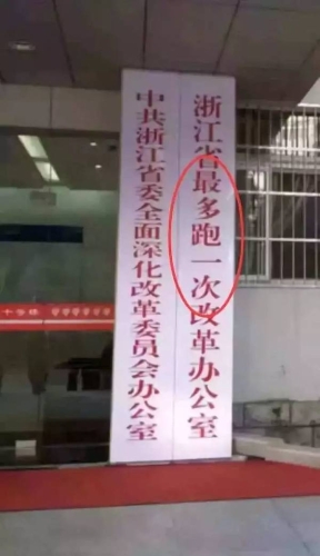 近日,一位網(wǎng)友在微博上曬出了浙江某政府單位的招牌,只見右邊的那塊招牌上寫著:“浙江省最多跑一次改革辦公室”。這張照片發(fā)布后,迅速獲得了大量網(wǎng)友的轉(zhuǎn)發(fā)、點贊。