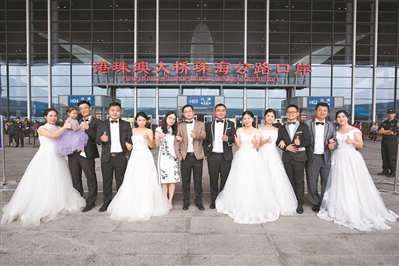 六對(duì)建設(shè)者夫妻回港珠澳大橋珠海公路口岸補(bǔ)拍婚紗照。