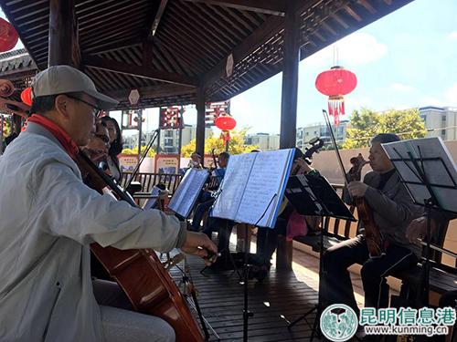 中心內(nèi)的老年人們一起彈奏表演。
