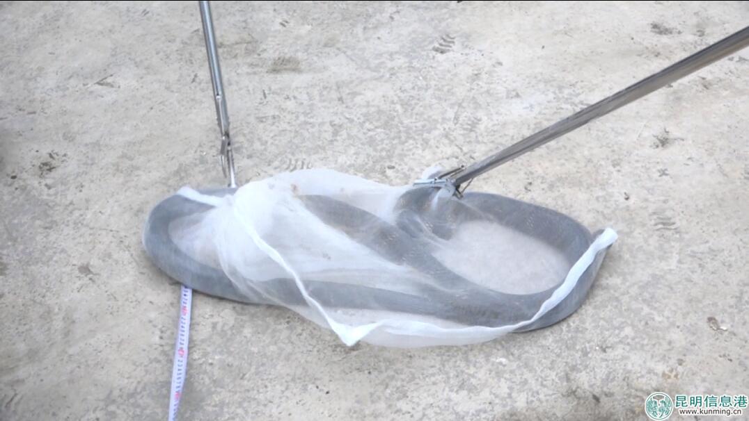 接警后,森林公安民警驅(qū)車趕到張師傅家,在昏暗的燈光下,只見一條大蛇躲在房間的衣柜下面,直立著身子,擺出一副攻擊架勢。當(dāng)民警伸出捕蛇鉗時(shí),大蛇迅速鉆到床底下,三名民警借助張師傅的手電光亮,合力用捕蛇鉗將大蛇緊緊夾住,拖出床底,裝到捕蛇袋里。