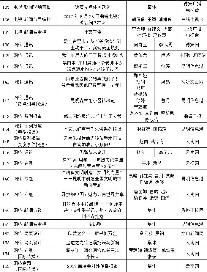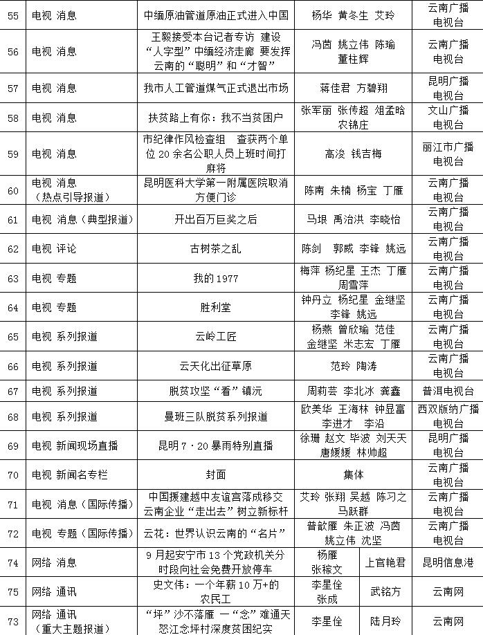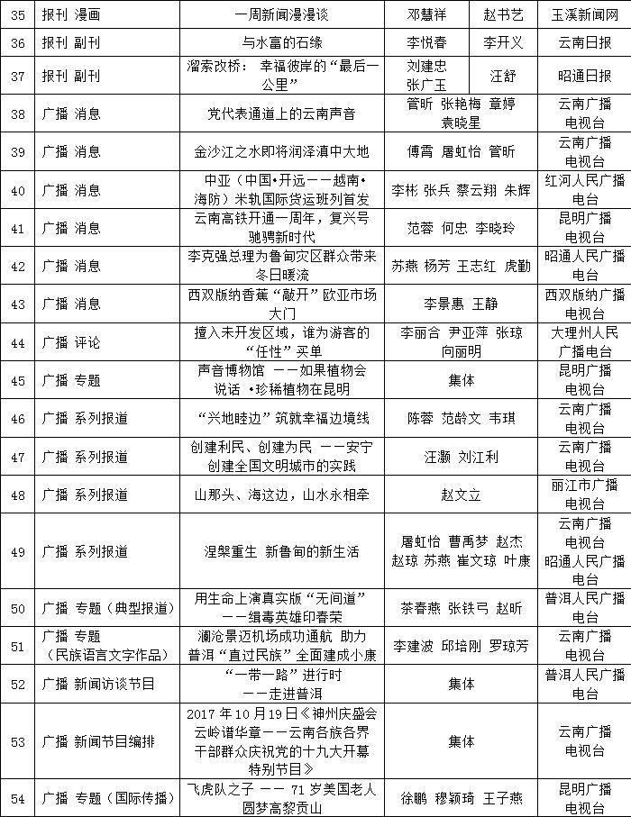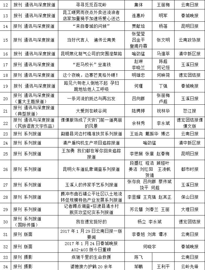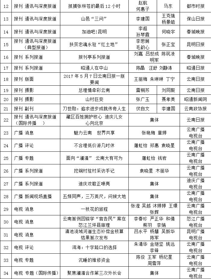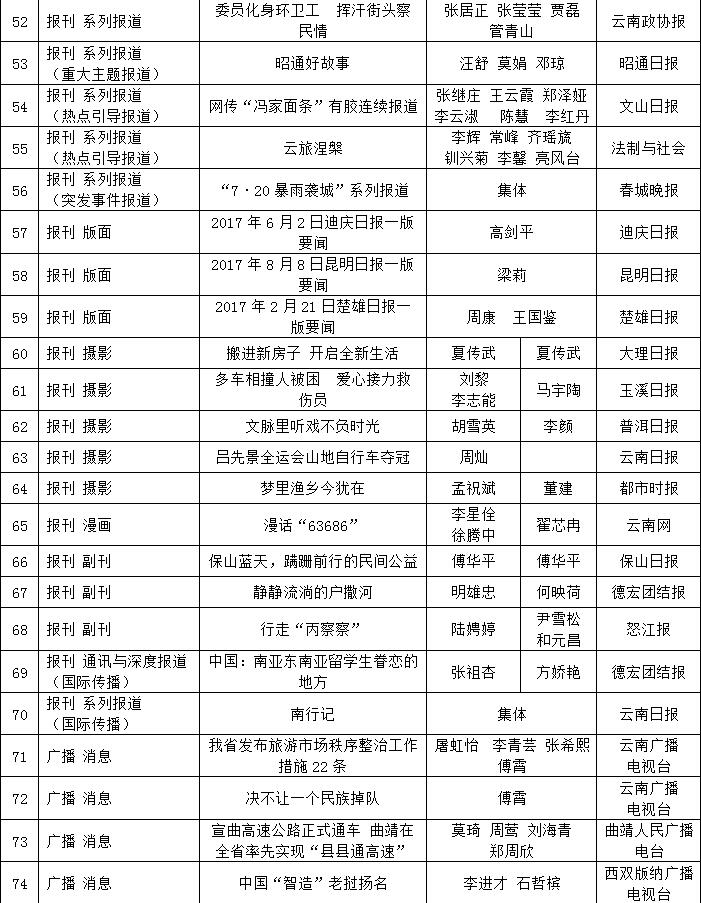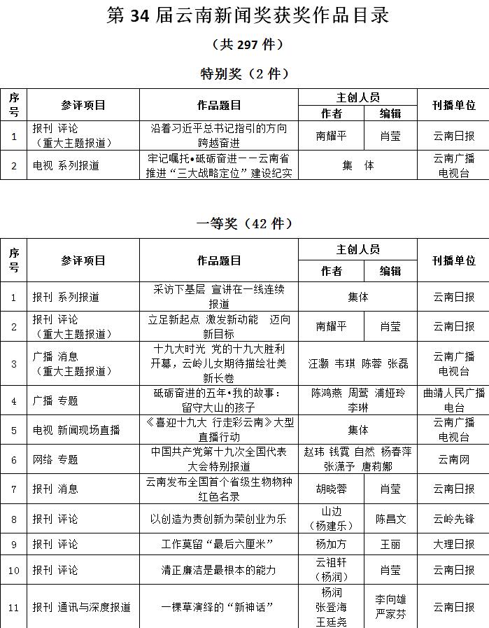 為充分檢閱我省新聞工作年度業(yè)績,展示新聞戰(zhàn)線“三項學(xué)習(xí)教育”活動和“走基層、轉(zhuǎn)作風(fēng)、改文風(fēng)”活動成果,省委宣傳部和省新聞工作者協(xié)會、省新聞學(xué)會組織了第34屆(2017年度)云南新聞獎評選活動。評選活動開展以來,全省各新聞單位積極推薦,報送了一大批主題鮮明、形式新穎的優(yōu)秀作品。經(jīng)云南新聞獎評選委員會精心組織、認(rèn)真評選,決定對297件新聞作品給予“云南新聞獎”獎勵,其中,給予《沿著習(xí)近平總書記指引的方向跨越奮進》等2件作品特別獎獎勵;給予《采訪下基層 宣講在一線連續(xù)報道》等42件作品一等獎獎勵;給予《我省育出全國最甜甘蔗品種》等87件作品二等獎獎勵;給予《云南新發(fā)現(xiàn)國內(nèi)最集中美國飛虎隊遺址群落》等166件作品三等獎獎勵。