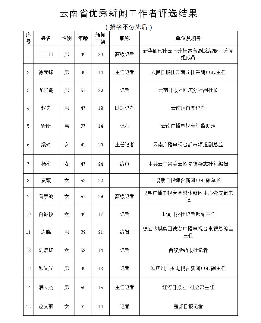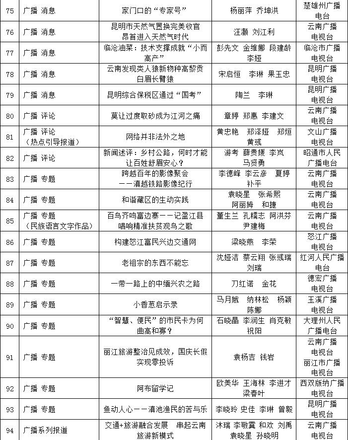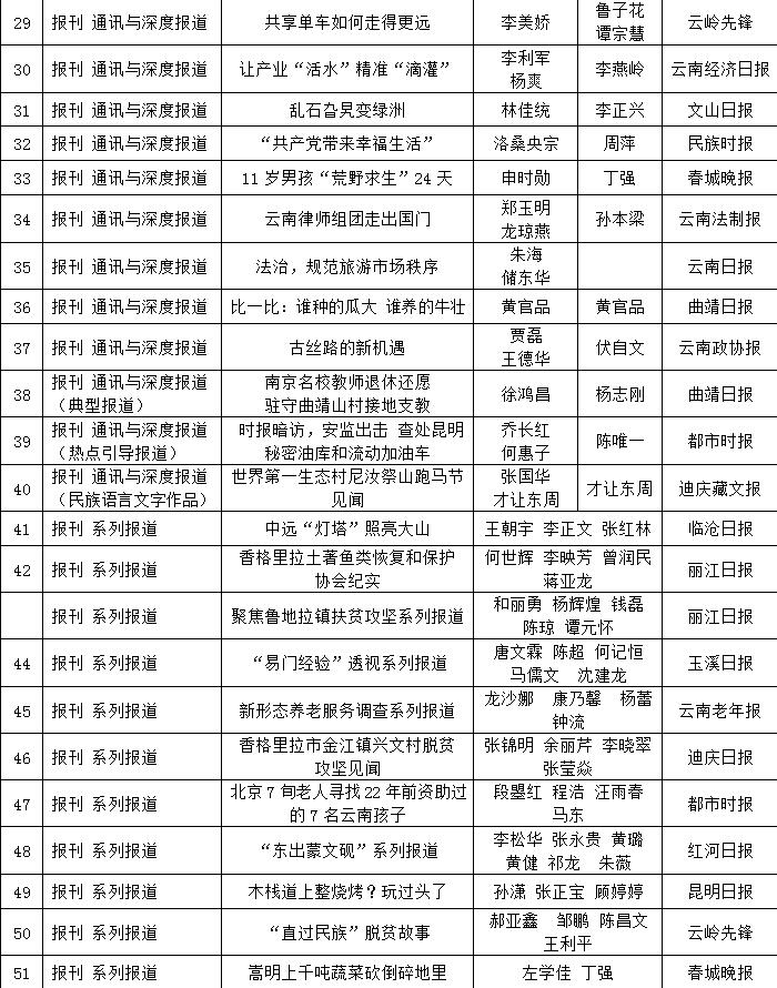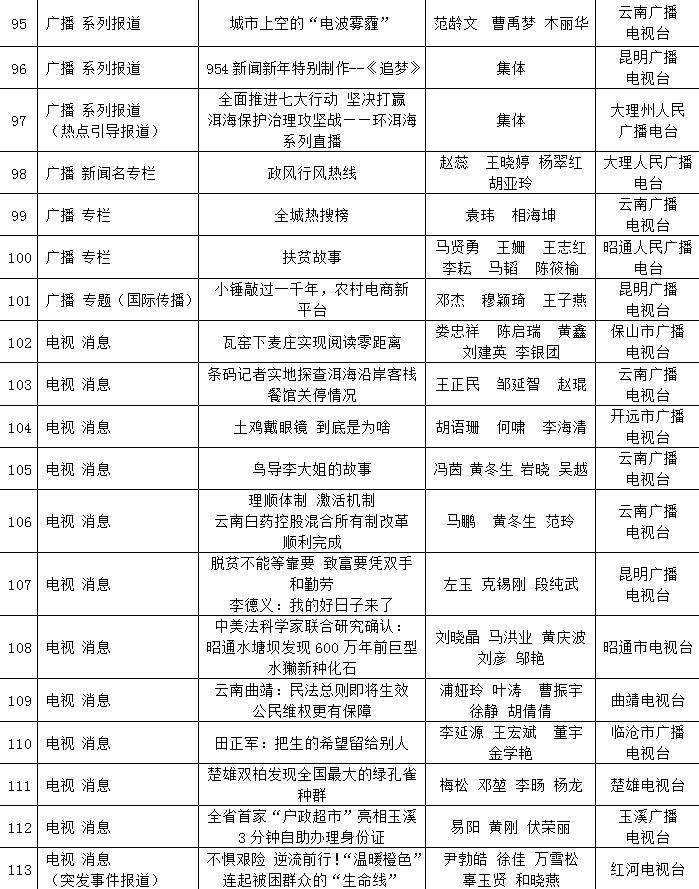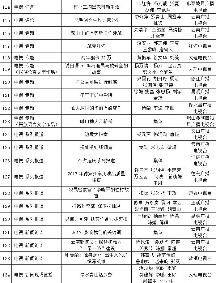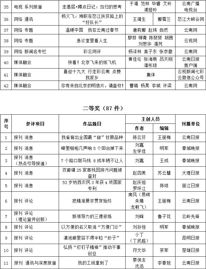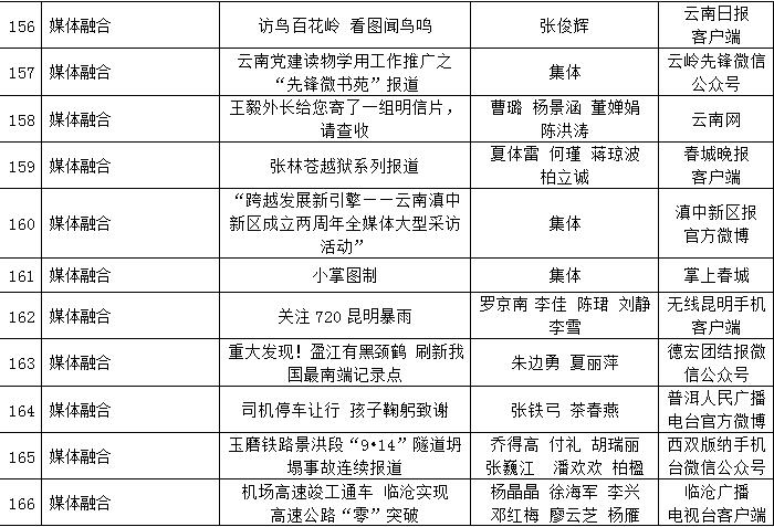 為充分檢閱我省新聞工作年度業(yè)績,展示新聞戰(zhàn)線“三項學(xué)習(xí)教育”活動和“走基層、轉(zhuǎn)作風(fēng)、改文風(fēng)”活動成果,省委宣傳部和省新聞工作者協(xié)會、省新聞學(xué)會組織了第34屆(2017年度)云南新聞獎評選活動。評選活動開展以來,全省各新聞單位積極推薦,報送了一大批主題鮮明、形式新穎的優(yōu)秀作品。經(jīng)云南新聞獎評選委員會精心組織、認(rèn)真評選,決定對297件新聞作品給予“云南新聞獎”獎勵,其中,給予《沿著習(xí)近平總書記指引的方向跨越奮進》等2件作品特別獎獎勵;給予《采訪下基層 宣講在一線連續(xù)報道》等42件作品一等獎獎勵;給予《我省育出全國最甜甘蔗品種》等87件作品二等獎獎勵;給予《云南新發(fā)現(xiàn)國內(nèi)最集中美國飛虎隊遺址群落》等166件作品三等獎獎勵。