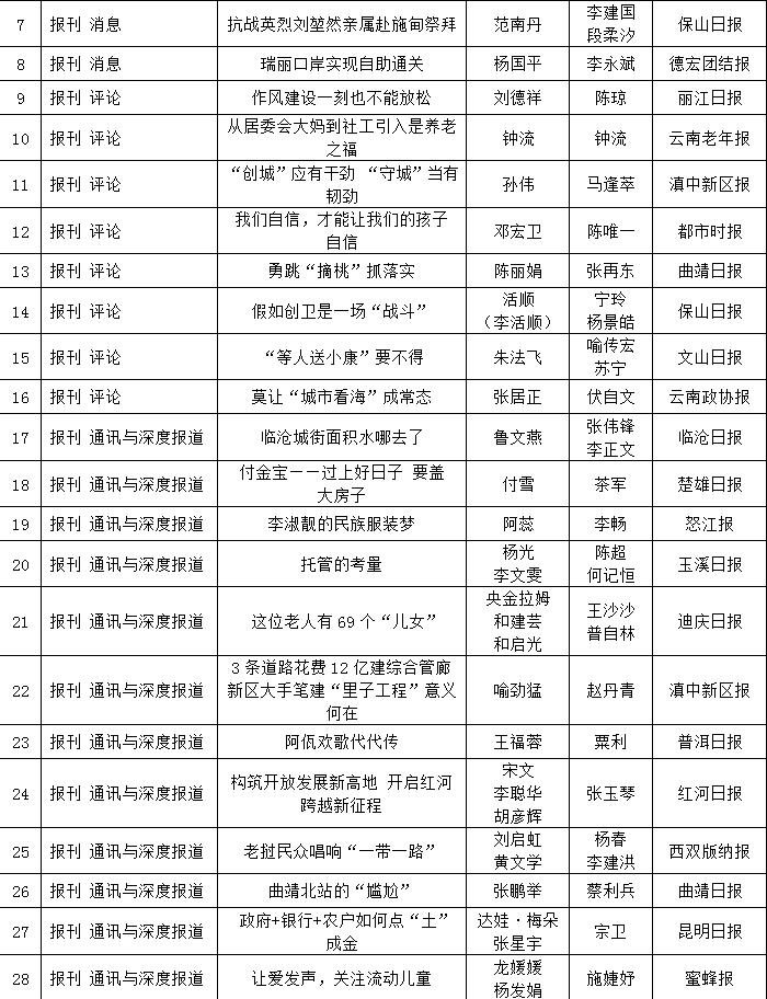 云南日報報業(yè)集團《影響力·云南傳媒》雜志刊發(fā)的新聞?wù)撐摹栋选八南蛩淖觥币舐鋵嵉接泤f(xié)工作實踐之中》獲二等獎;《云南日報》刊發(fā)的文字消息《云南發(fā)布全國首個省級生物物種紅色名錄》和文字系列《“采訪下基層 宣講在一線”系列報道》,《保山日報》的文字通訊《山邑“三問”》,怒江廣播電視臺的電視消息《云南首例因輟學(xué)“官告民”案在怒江蘭坪縣審理》獲三等獎。
