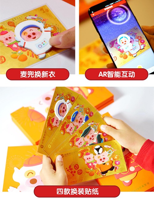 據(jù)了解,AR智能科技和互動(dòng)體驗(yàn)是今年壓歲金的一大亮點(diǎn)。豬年壓歲金特意為小朋友們準(zhǔn)備了四款實(shí)體換裝貼紙,讓小朋友們親手幫麥兜穿上“夢(mèng)想戰(zhàn)衣”,下載App掃描換裝后的壓歲金,就與不同職業(yè)的麥兜互動(dòng),科技感和互動(dòng)性超棒的黃金壓歲錢更受小朋友喜歡。