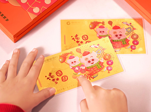 同時(shí),在工藝方面,《中國建設(shè)銀行豬年壓歲金》還運(yùn)用了鐳射彩印工藝,讓鯉魚、燈籠、熱氣球、飛機(jī)都鮮活了起來;小朋友搓搓壓歲金上的桔子,還有桔子香,這是香味油墨帶來的驚喜。從視覺到嗅覺,為小朋友們打造一張好看好玩的黃金壓歲錢。