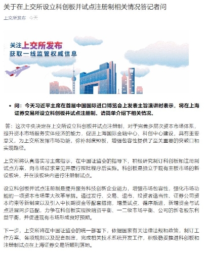 14:54分,上交所發(fā)布關(guān)于在上交所設(shè)立科創(chuàng)板并試點(diǎn)注冊制相關(guān)情況答記者問表示,科創(chuàng)板是獨(dú)立于現(xiàn)有主板市場的新設(shè)板塊,并在該板塊內(nèi)進(jìn)行注冊制試點(diǎn)。