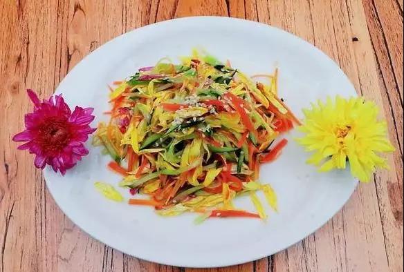 說到用菊花拌涼菜,筆者也是在華亭寺里嘗到的。因?yàn)楫?dāng)時(shí)年輕氣盛,再加上天天抽煙喝酒,內(nèi)火太重,時(shí)常會(huì)無緣無故地流鼻血。妙鐘師傅特意叫齋堂里給我做菊花菜,連吃幾天后居然癥狀全消。為了學(xué)習(xí)這一美味的食療廚藝,我特意觀察過妙善師傅的制作過程:即先將鮮菊花瓣摘洗干凈,控凈水。放入鹽腌十分鐘后擠去多余的水份。將檸檬汁滴入菊花瓣中拌勻,再加入黃瓜絲、甘藍(lán)絲、或蘿卜絲拌勻。然后將蒜切碎,加入鹽、白糖、雞精、醋、熟香油拌勻即可。菊花具有淡淡的香味,風(fēng)味獨(dú)特,涼爽可口,適合悶熱的秋季食用。“云南十八怪,鮮花拌涼菜”,說的就是這一美味。