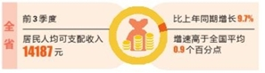 前3季度,全省城鎮(zhèn)常住居民人均可支配收入24742元,增長8.3%,增速高于全國平均0.4個百分點(diǎn)。全省農(nóng)村常住居民人均可支配收入7046元,增長9.2%,增速高于全國平均0.3個百分點(diǎn)。