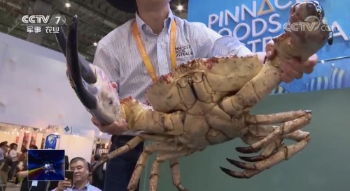 一家澳大利亞企業(yè)的展臺前,來自澳大利亞的長壽海鮮吸引很多觀眾圍觀拍照。參展商工作人員介紹說,“澳大利亞皇帝蟹每一個大概有13斤,蟹鉗可以把人的手指切斷,這只皇帝蟹大概有40歲左右,另外一只大的大概有80歲了。另外就是澳大利亞的南池龍蝦,大概八斤左右,年齡大概30--40歲了。這些海鮮從澳大利亞墨爾本運到上海,乘坐了10個小時的飛機,這么大的年齡,首次飛這么長的路到中國,它們這次也不容易?!?/p>