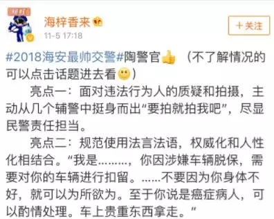 亮點(diǎn)四:行為人拿不久前因交通事故出事的交警說(shuō)事,其惡毒之意可見(jiàn)了得。陶警官一句“身體不好,不要笑話別人。不然你這癌癥的事怎么解釋?誰(shuí)還沒(méi)個(gè)意外啥的,嘴巴要留德?!彼膬蓳芮Ы?行為人這是搬石頭砸了自己的腳。
