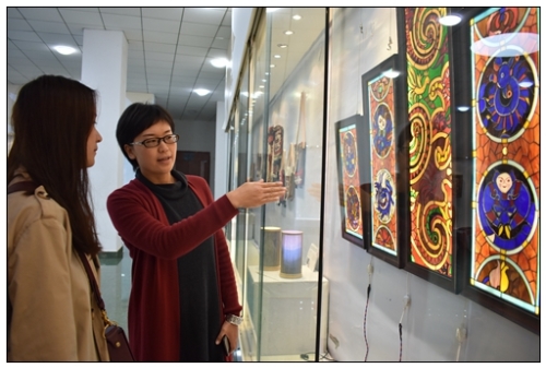 此外,現(xiàn)場展出的陶藝作品、刺繡及布藝作品,也將苗族民間工藝與現(xiàn)代人喜歡的產(chǎn)品設(shè)計(jì)方式相結(jié)合,在傳承苗族民間工藝的同時(shí),也做了大量創(chuàng)新,美感十足。李爽是本次展覽作品《玻璃·繡》的設(shè)計(jì)者,一直就對苗族傳統(tǒng)文化感興趣的她,展出的作品將承載著苗族歷史的刺繡圖案元素與西方的彩繪玻璃相結(jié)合,顏色豐富,極具西方特色與中國苗族風(fēng)情。