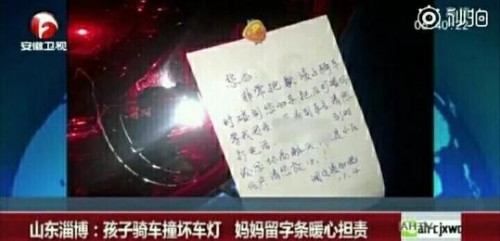 非常抱歉孩子騎車碰到您的車,把后燈撞壞。等我回來沒有看到車主,請您打電話XXX。到時(shí)給您協(xié)商解決。都是小區(qū)住戶,請您放心!