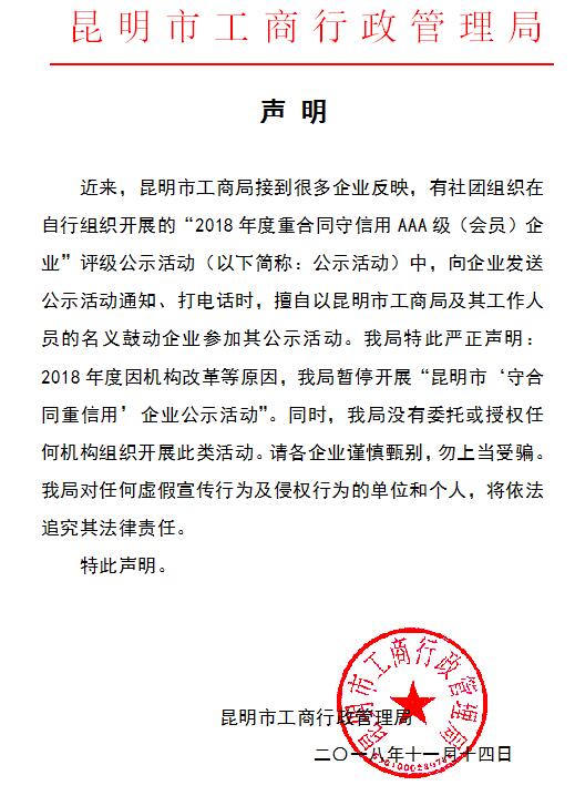 昆明信息港訊 11月14日,昆明市工商行政管理局發(fā)布聲明,2018年因機(jī)構(gòu)改革等原因,市工商局暫停開展“昆明市‘重合同守信用’企業(yè)公示活動(dòng)”,請(qǐng)各企業(yè)謹(jǐn)慎甄別,勿上當(dāng)受騙。詳細(xì)如下: