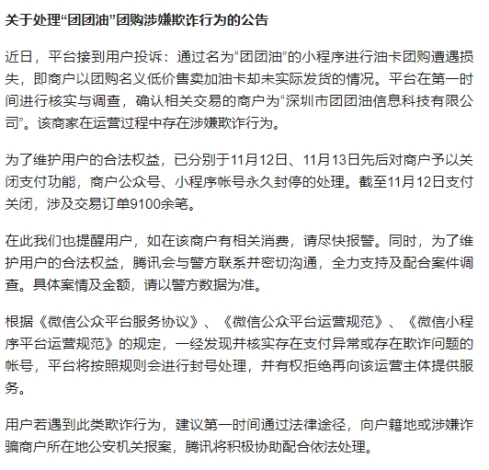 根據(jù)微信發(fā)布的公告,在11號收到用戶投訴后,12號就關(guān)閉了支付功能,13號封停小程序和公眾號。截至11月12日支付關(guān)閉,涉及交易訂單9100余筆。據(jù)受害者說法,警方已經(jīng)立案,騰訊也在積極配合調(diào)查。而這種情況下,案情和金額的公布都必須以警方公布為準(zhǔn),否則就會干擾辦案程序。