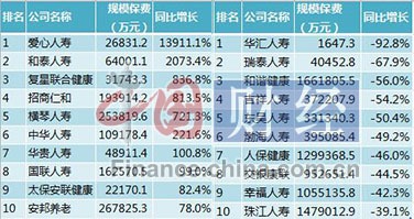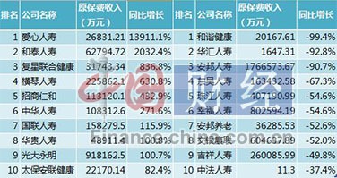 從原保費(fèi)收入情況來看,愛心人壽、和泰人壽、復(fù)星聯(lián)合健康、橫琴人壽、招商仁和、中華人壽、國聯(lián)人壽、華貴人壽和光大永明等9家人身險公司的增長幅度均在100%。而與此形成對比的是,和諧健康、華匯人壽、安邦人壽、東吳人壽、珠江人壽、幸福人壽、安邦養(yǎng)老和交銀康聯(lián)等8家人身險公司的下降幅度均超過了50%。
