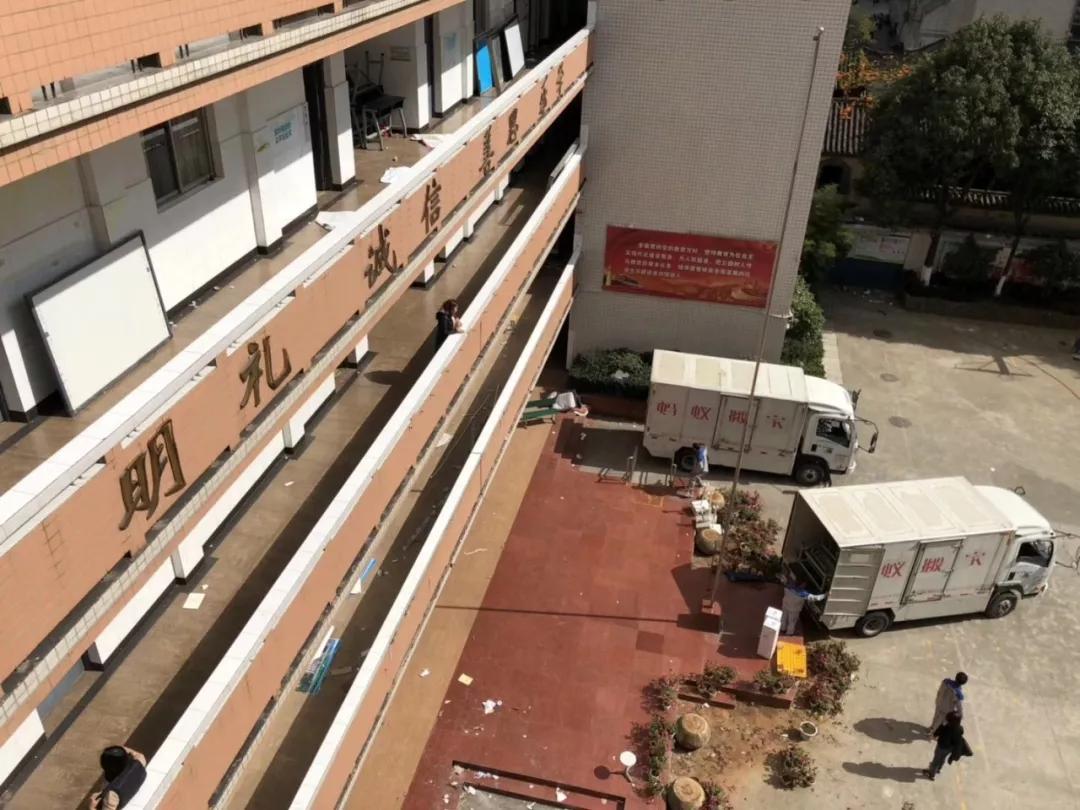 記者到達(dá)時(shí),施工人員正在拆外墻的裝飾,操場(chǎng)里停著兩張搬家公司的車輛。學(xué)校的老師,往屆畢業(yè)的學(xué)生紛紛到操場(chǎng)上、校門外拍照留念。