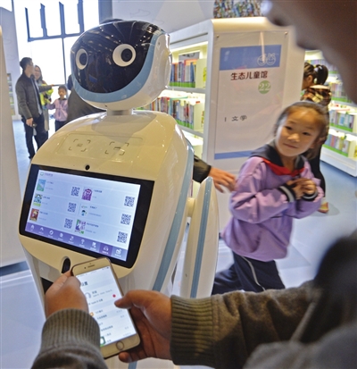 讀者與圖書(shū)館內(nèi)的機(jī)器人“小圖”互動(dòng)