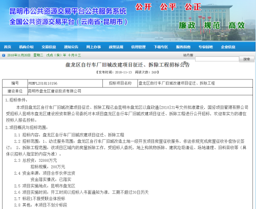 11月20日,掌上春城記者從昆明市公告資源交易網(wǎng)獲悉,11月13日,昆明市公共資源交易網(wǎng)發(fā)布了“盤龍區(qū)自行車廠舊城改建項目征遷、拆除工程招標(biāo)公告”,據(jù)公告內(nèi)容顯示, 中標(biāo)單位需要完成自行車廠的房屋征收補(bǔ)償協(xié)議簽訂,以及項目區(qū)域內(nèi)的房屋拆除工作,開工時間以招標(biāo)人書面通知為準(zhǔn),工期不超過30天。