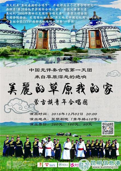 昆明信息港訊 記者陳盈盈 12月2日,由內(nèi)蒙古民族藝術(shù)劇院蒙古族青年合唱團(tuán)承辦、國(guó)家藝術(shù)基金資助的無(wú)伴奏合唱音樂(lè)會(huì)——“美麗的草原我的家”將來(lái)昆明巡演,為觀眾展現(xiàn)蒙古族歌曲的魅力及蒙古族文化的深厚底蘊(yùn)。