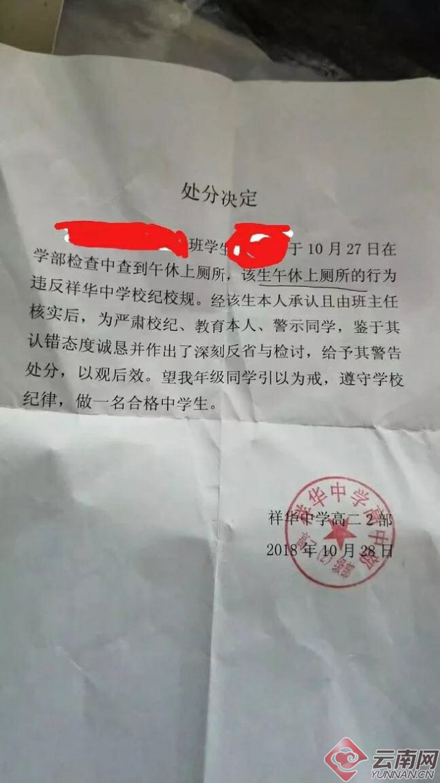 11月18日,有網(wǎng)友報(bào)料稱,云南大理祥華中學(xué)一學(xué)生因午休上廁所被學(xué)校警告處分,并配發(fā)了一張加蓋單位公章的“處分決定”。此信息經(jīng)網(wǎng)絡(luò)傳播后引發(fā)大量關(guān)注和熱議,多名網(wǎng)友對(duì)學(xué)校“午休不能上廁所”這一規(guī)定提出質(zhì)疑,并稱“尿急,肚子不舒服難道憋著嗎?”、“這學(xué)校有病吧”、“不知道長(zhǎng)期憋尿傷身體嗎?”?! ?nbsp;