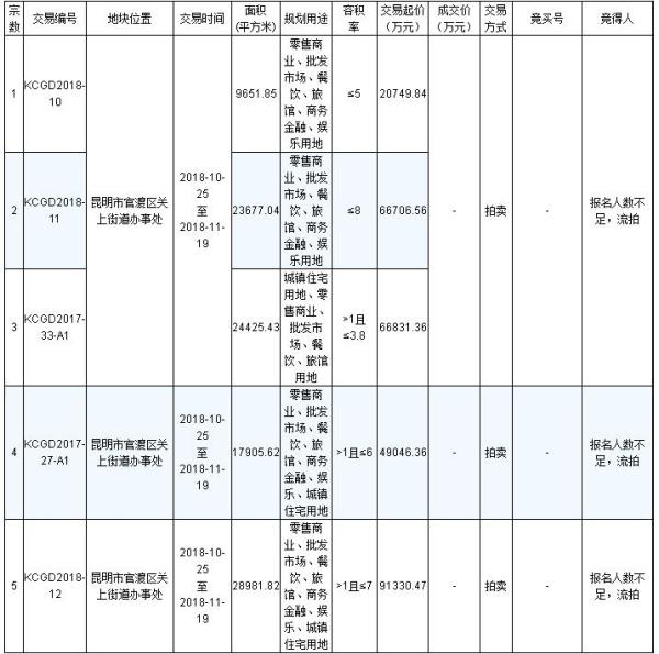 按照計劃,11月21日下午,巫家壩又將有5宗土地要進行網(wǎng)上拍賣,這5宗地約157畝地、起價約29.46億,位于巫家壩核心區(qū),但根據(jù)昆明市土地和礦業(yè)權(quán)交易網(wǎng)公布的消息,由于報名人數(shù)不夠,5宗地均已流拍。這是10月以來昆明土地市場第四起宣告失敗的交易,也是去年以來巫家壩首次出現(xiàn)土地流拍。