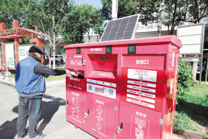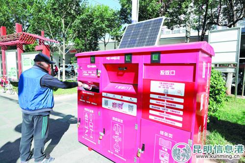 昆明信息港訊(昆明日報 記者李海曦)近日,太陽能智能回收箱亮相昆明街頭。盡管先期只試點(diǎn)投放了3個,卻引起了許多市民的興趣。在投放點(diǎn)之一的桃源廣場上,記者看到一個紅色的類似快遞存放柜的箱子顯得很醒目。這個回收箱頂上有一塊太陽能光板,通過太陽能光板收集能量供箱內(nèi)電池工作。周邊居民可將家中廢舊紡織品、紙張、塑料品等進(jìn)行分類投入回收箱,通過微信小程序掃碼,回收箱會自動稱重,然后給出積分,投放者可用積分在社區(qū)超市兌換物品。
