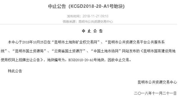 繼巫家壩片區(qū)5宗土地20日宣布流拍后,巫家壩今日又有1宗約17.5畝的商業(yè)用地中止了交易。21日,昆明市國(guó)土資源局發(fā)布了關(guān)于KCGD2018-20-A1號(hào)地塊的中止交易公告。據(jù)公告顯示:地塊因故中止交易。