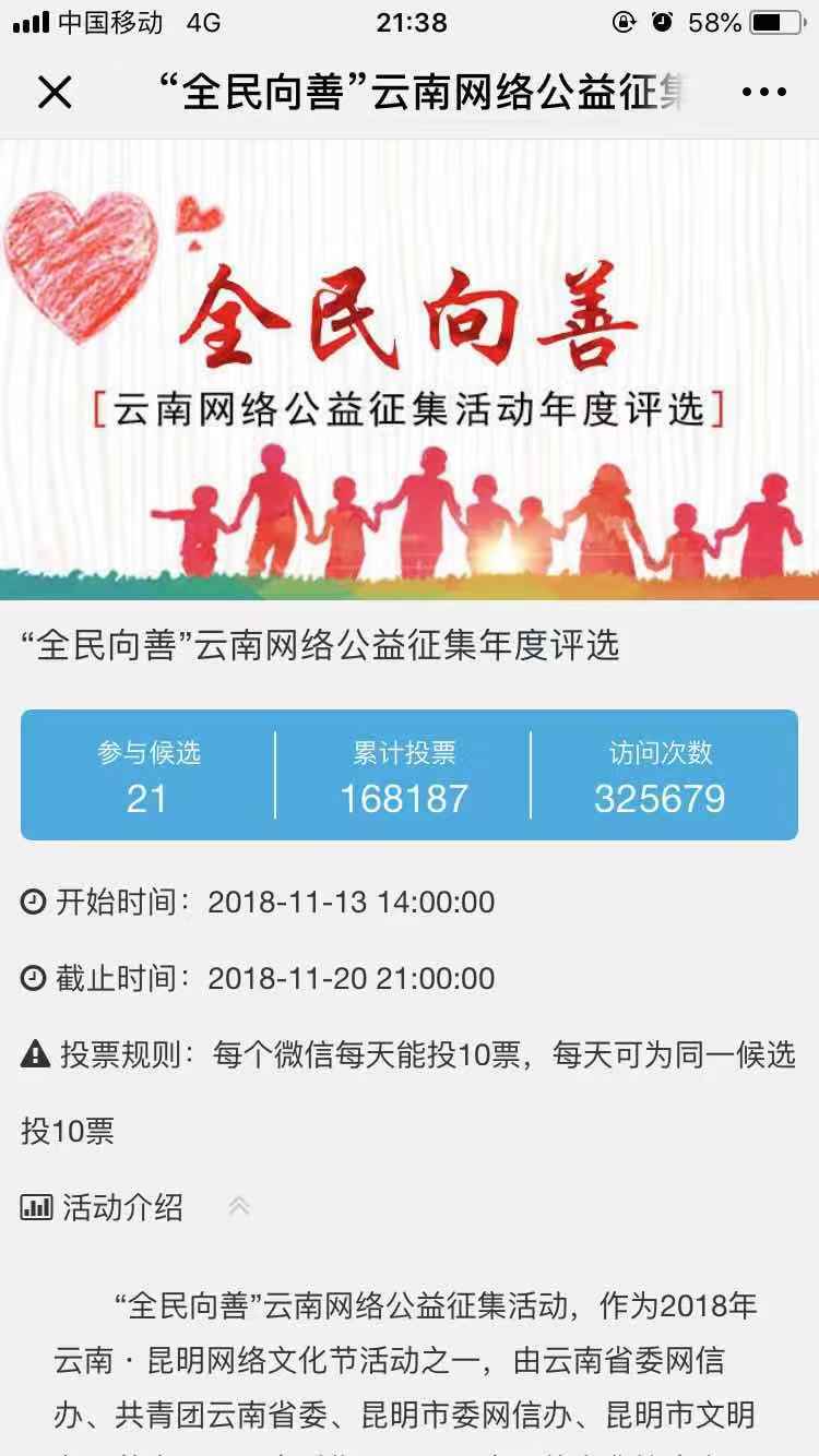 活動于11月進(jìn)行主辦方初評與網(wǎng)絡(luò)投票,并于11月13日14點打通網(wǎng)絡(luò)投票渠道,開展了“2018云南網(wǎng)絡(luò)公益之星”網(wǎng)絡(luò)投票評選,參與候選的組織、項目、個人等有21個,投票與11月20日21點結(jié)束,投票期間,這些公益組織、項目、個人的故事感動了很多人,他們也受到了市民的熱情歡迎與支持,最終讓盲人朋友們用耳朵“看”一場電影的昆明心目影院獲得了最高的票數(shù),脫穎而出,成為了本屆網(wǎng)絡(luò)公益之星。