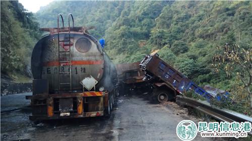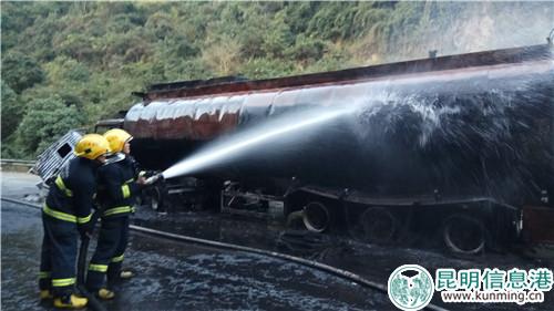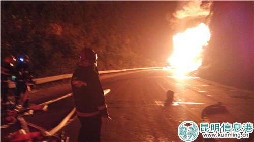 昆明信息港訊 記者勞學(xué)麗 11月21日凌晨1時25分許,臨滄市臨翔區(qū)祥臨公路往羊頭巖方向息鋪塘路段16公里處,一輛載有30噸汽油的油罐車同相鄰車輛相撞造成所攜汽油發(fā)生燃燒爆炸。臨滄市公安消防支隊指揮中心接警后,隨即調(diào)集支隊全勤指揮部、特勤中隊、臨翔區(qū)中隊5車23人趕赴現(xiàn)場。