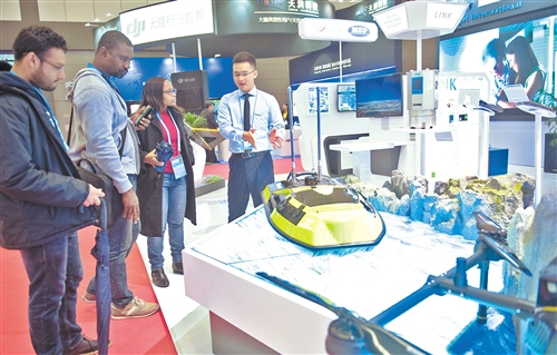 11月18日,首屆聯(lián)合國(guó)世界地理信息大會(huì)技術(shù)與應(yīng)用展覽在浙江省德清縣開幕。圖為展商向參觀者介紹一款智能無人測(cè)量船。 新華社記者翁忻旸/攝