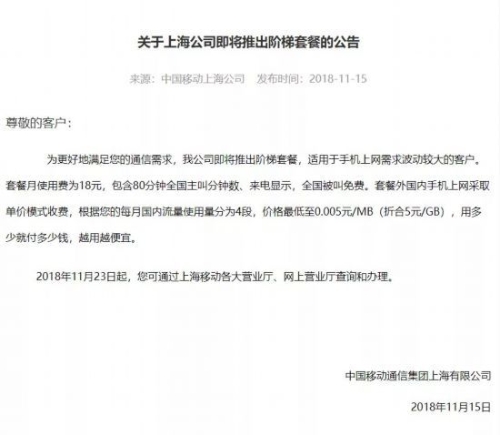 早在上個星期,中國移動上海公司就發(fā)布將推出階梯套餐的公告。新套餐月使用費為18元,包含80分鐘全國主叫分鐘數(shù)、來電顯示,全國被叫免費。套餐之外的國內(nèi)手機上網(wǎng)流量采取單價模式收費,根據(jù)用戶每月使用量分為4段,價格最低至0.005元/MB,也就是折合5元/GB。中國移動在公告中表示“用多少就付多少錢,越用越便宜?!?/p>