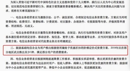 此前工信部表示:鼓勵基礎電信企業(yè)為用戶推出根據(jù)使用量給予優(yōu)惠折扣的階梯定價式資費方案,2018年應在部分地區(qū)試點推出至少1種,滿足部分用戶的消費需求。