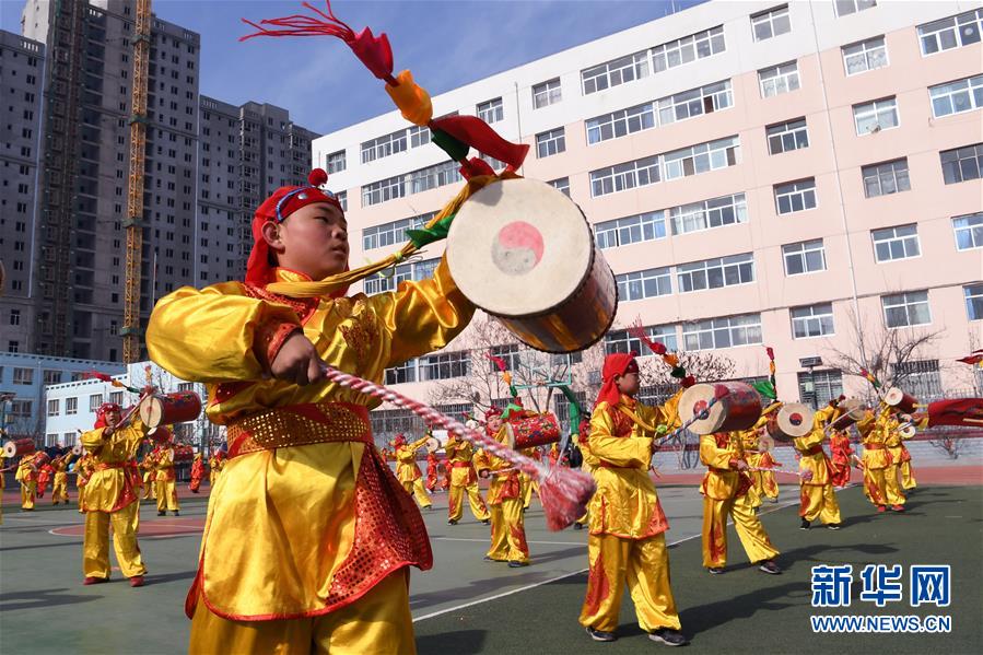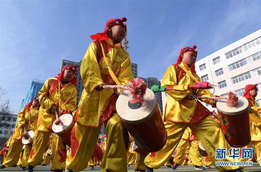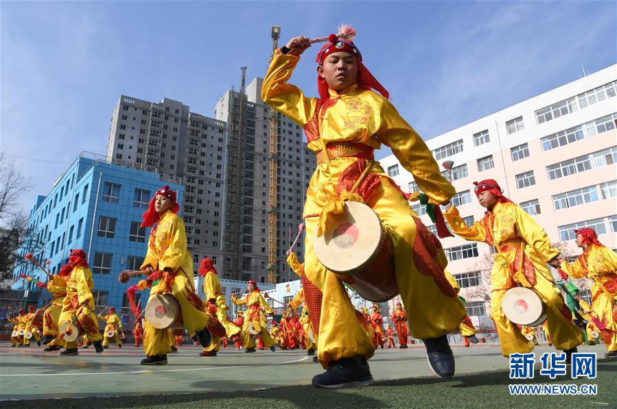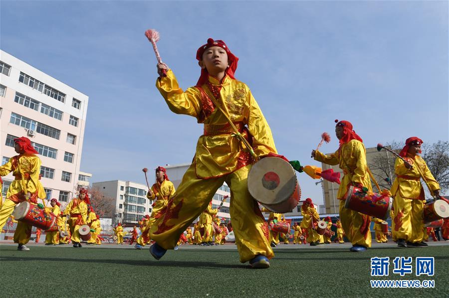 11月22日,在皋蘭縣石洞小學(xué),學(xué)生們齊舞蘭州太平鼓。(新華社 記者范培珅 攝)