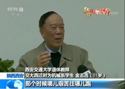 西安交通大學(xué)退休教師 交大西遷時為機械系學(xué)生(81歲) 金志浩:唱著《再見媽媽》就一路就奔到西安來了。那個時候哪兒艱苦往哪兒跑,黨的需要就是我的志愿,那是沒話的,也不在乎艱苦。