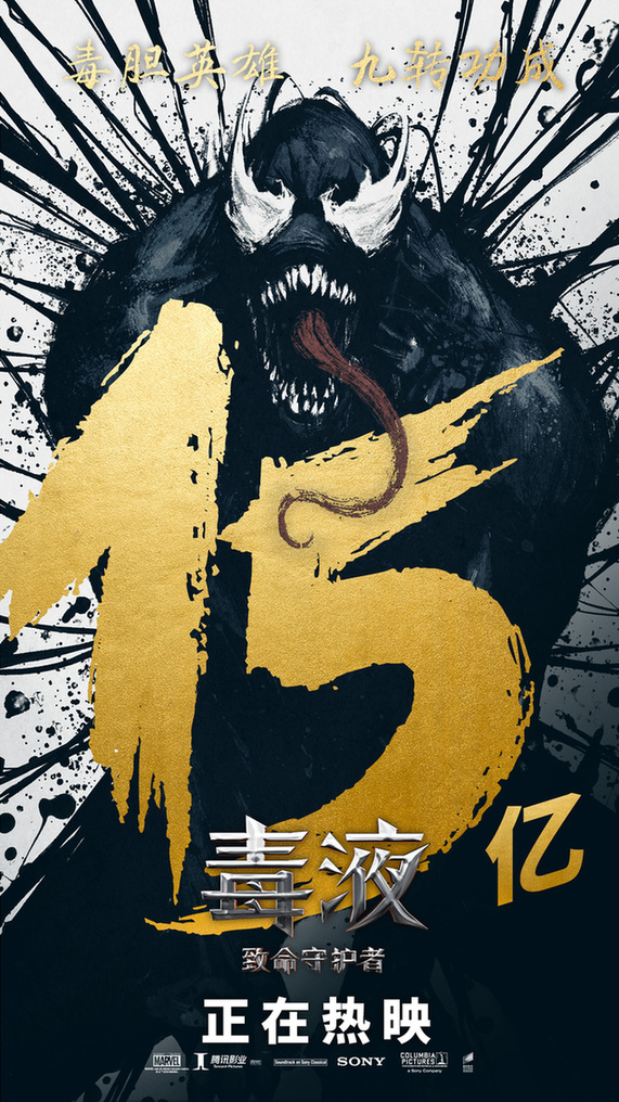 《毒液:致命守護(hù)者》自11月9日上映以來,票房一路飄紅,累計(jì)已達(dá)15億,是目前內(nèi)地票房最高的單人超英電影。影片連續(xù)13天蟬聯(lián)內(nèi)地單日票房冠軍,超過《復(fù)仇者聯(lián)盟3》(連續(xù)11天)的紀(jì)錄。自內(nèi)地公映以來,《毒液:致命守護(hù)者》就不斷的刷新內(nèi)地影史多項(xiàng)紀(jì)錄。其中,漫威單人超英首映日預(yù)售紀(jì)錄,零點(diǎn)場紀(jì)錄,最快破億紀(jì)錄,首周末票房紀(jì)錄,次周票房紀(jì)錄,每一個(gè)都被“毒液”刷新并且抬到全新高度,堪稱漫威電影史的一大“奇跡”。