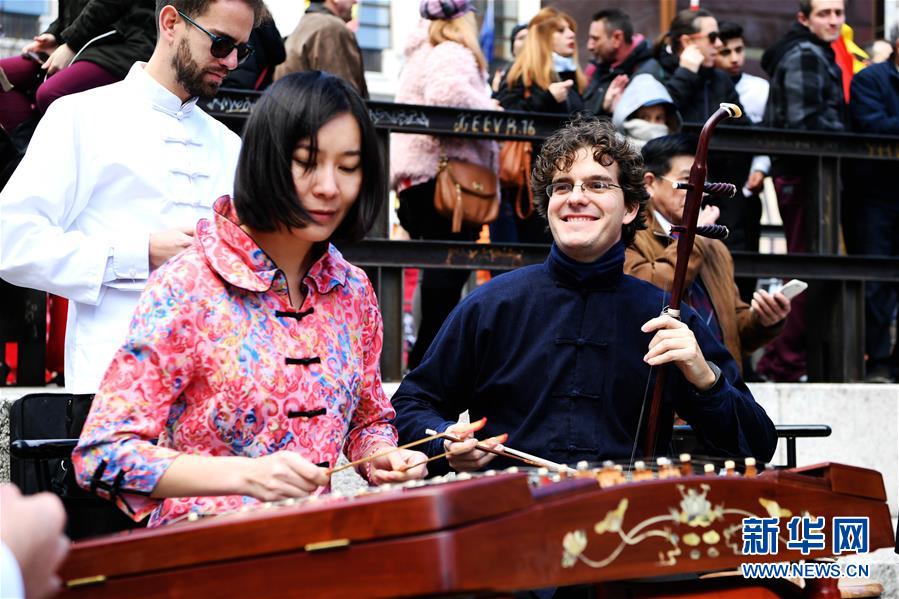 2018年2月11日,在西班牙馬德里,參加弘揚(yáng)中國(guó)傳統(tǒng)文化的“快閃”藝術(shù)表演演員在索菲亞王后博物館前演奏民樂(lè)。新華社記者郭求達(dá)/攝