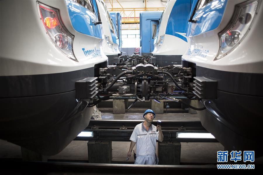 2017年4月11日,在位于阿根廷首都布宜諾斯艾利斯以南的利亞瓦略爾,中方技術(shù)人員檢查為羅卡線(xiàn)城際鐵路提供的列車(chē)。近年來(lái),在阿根廷,中車(chē)制造的各種軌距、各種制式、各種型號(hào)的鐵路機(jī)車(chē)、動(dòng)車(chē)組、客車(chē)、貨車(chē)和地鐵列車(chē)密集交付。新華社發(fā)(馬丁·薩巴拉 攝)
