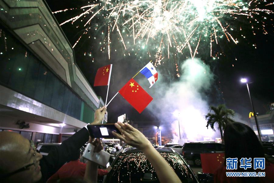 2017年6月12日,在巴拿馬首都巴拿馬城的華人社區(qū),人們?cè)诎湍民R與中國(guó)建交的慶?;顒?dòng)上拍攝煙花。新華社發(fā)(毛里西奧·巴倫蘇埃拉攝)