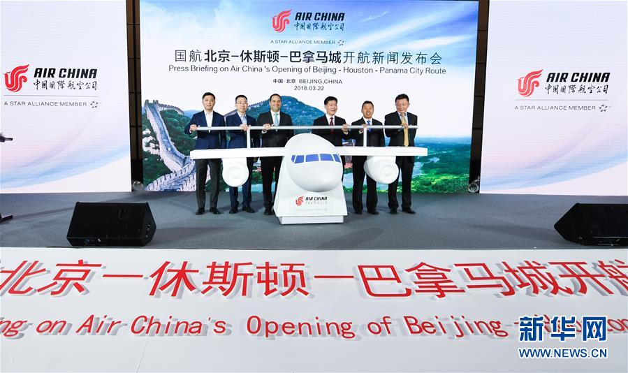 2018年3月22日,嘉賓在北京為北京—休斯頓—巴拿馬城航線(xiàn)開(kāi)通揭幕。中國(guó)國(guó)際航空公司于4月5日開(kāi)通此條新航線(xiàn)。新華社記者李賀/攝