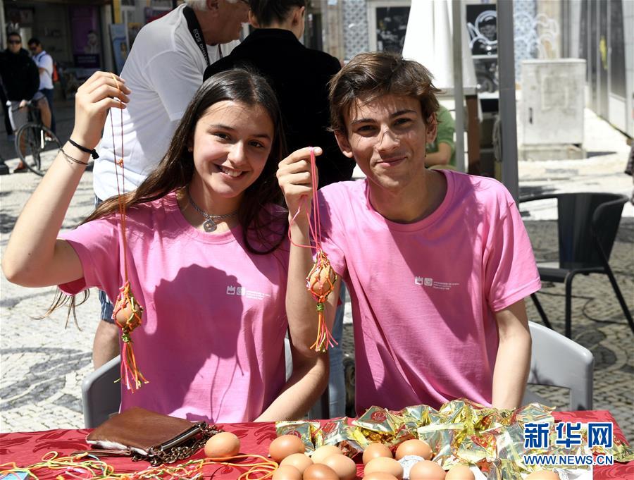 2018年6月16日,在葡萄牙阿威羅舉行的端午龍舟巡游活動(dòng)開(kāi)幕式上,阿威羅大學(xué)孔子學(xué)院的學(xué)生展示他們制作的蛋袋。新華社記者張立云/攝