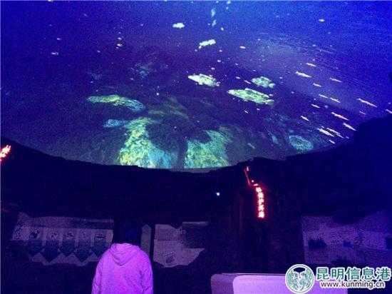 在“洱海保護(hù)”展廳,屋頂是個球體全景屏幕,通過設(shè)在房子正中的操控臺,可以調(diào)取水質(zhì)、水量資料;通過球體屏幕,跟隨主人公的視角尋找弓魚,以小見大,感受洱海被污染的過程和危機(jī)四伏的境況,感受面臨失去母親湖的切膚之痛。