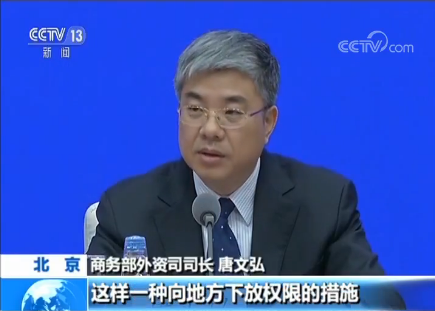 商務部外資司司長 唐文弘:第一個還是推進簡政放權。在這里頭既有進一步放寬外商投資建設工程設計企業(yè),降低準入門檻的措施。也有授予自貿試驗區(qū)自由進出口技術合同登記管理權限,這樣一種向地方下放權限的措施。