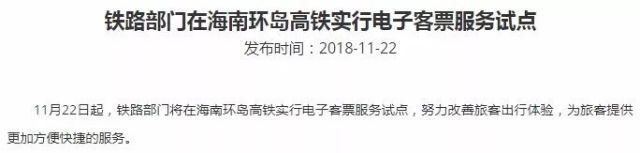 11月22日中國(guó)鐵路總公司官網(wǎng)稱,自11月22日起,鐵路部門將在海南環(huán)島高鐵實(shí)行電子客票服務(wù)試點(diǎn)。