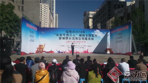 11月24日,昆明市2018年“百業(yè)千商萬人”誠信主題宣傳暨誠信示范街區(qū)創(chuàng)建活動在五華區(qū)南屏步行街廣場舉行,該活動旨在弘揚誠信文化,營造重視誠信、堅守誠信的社會氛圍。