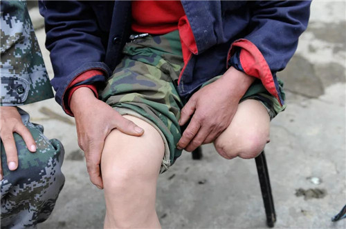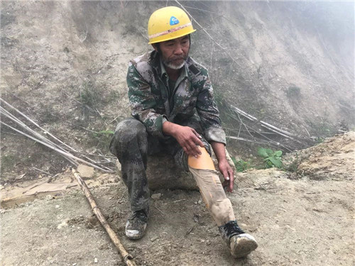 54歲的猛硐鄉(xiāng)鄉(xiāng)民盤金良,趕了8公里山路早早地來到這里。自家的草果地就在這片雷區(qū),掃雷官兵在此作業(yè)時,他時常過來默默地守在雷場邊。在地里勞作時,盤金良曾經(jīng)兩次觸雷,前一次炸掉了右腿,后一次炸掉了左腿。早已習慣了假肢的他,如今走路還是離不開拐杖。