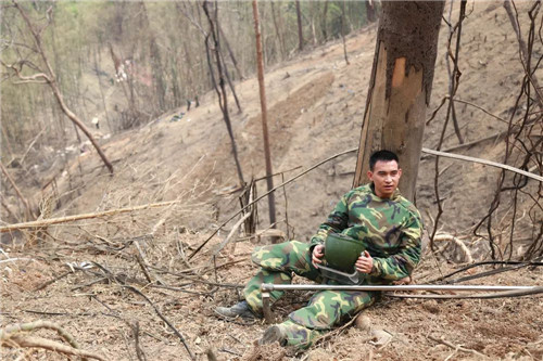 在老山某雷場掃雷間隙,杜富國靠著一棵大樹休息。黃巧/攝