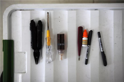 杜富國的儲物箱蓋上,擺放著他最常用的鉗子、螺絲刀、試電筆。彭希/攝